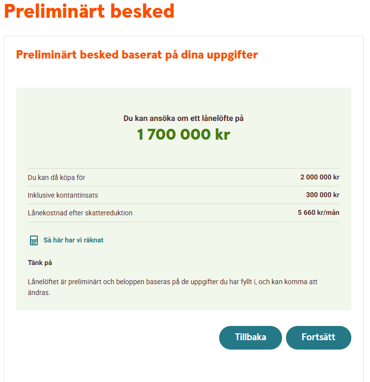 Om din ansökan godkänns får du ett lånelöfte som anger maxbeloppet du kan låna. Detta är inte ett slutgiltigt godkännande av ett bolån, utan ett preliminärt besked. När du hittar en bostad gör banken en ny bedömning innan lånet beviljas.
