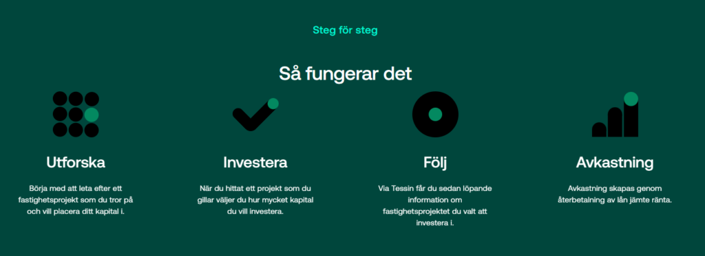 På hemsidan Tessin.com registrerar du ett konto och väljer sedan vilka projekt du vill investera i. Projekten är varierande i risk och avkastningspotential.