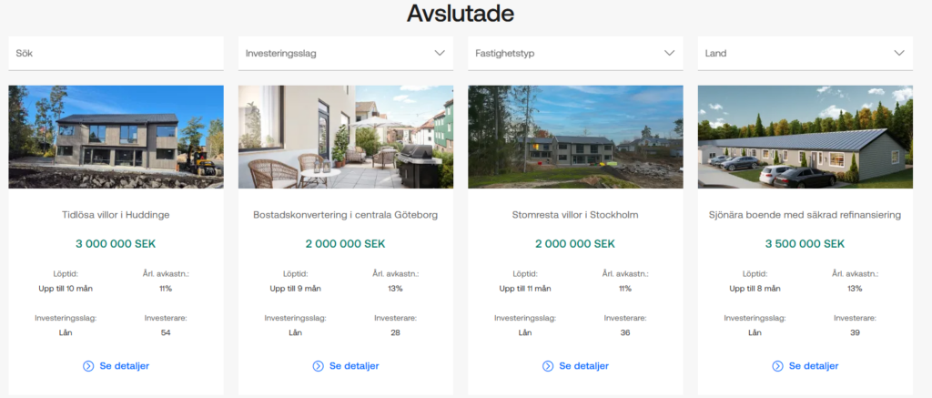Hos Tessin hittar du en mängd olika projekt där kraven på avkastning, löptid och minimum investering skiljer sig åt. Nedan följer några exempel på projekt som Tessin tidigare haft ute på sin hemsida.